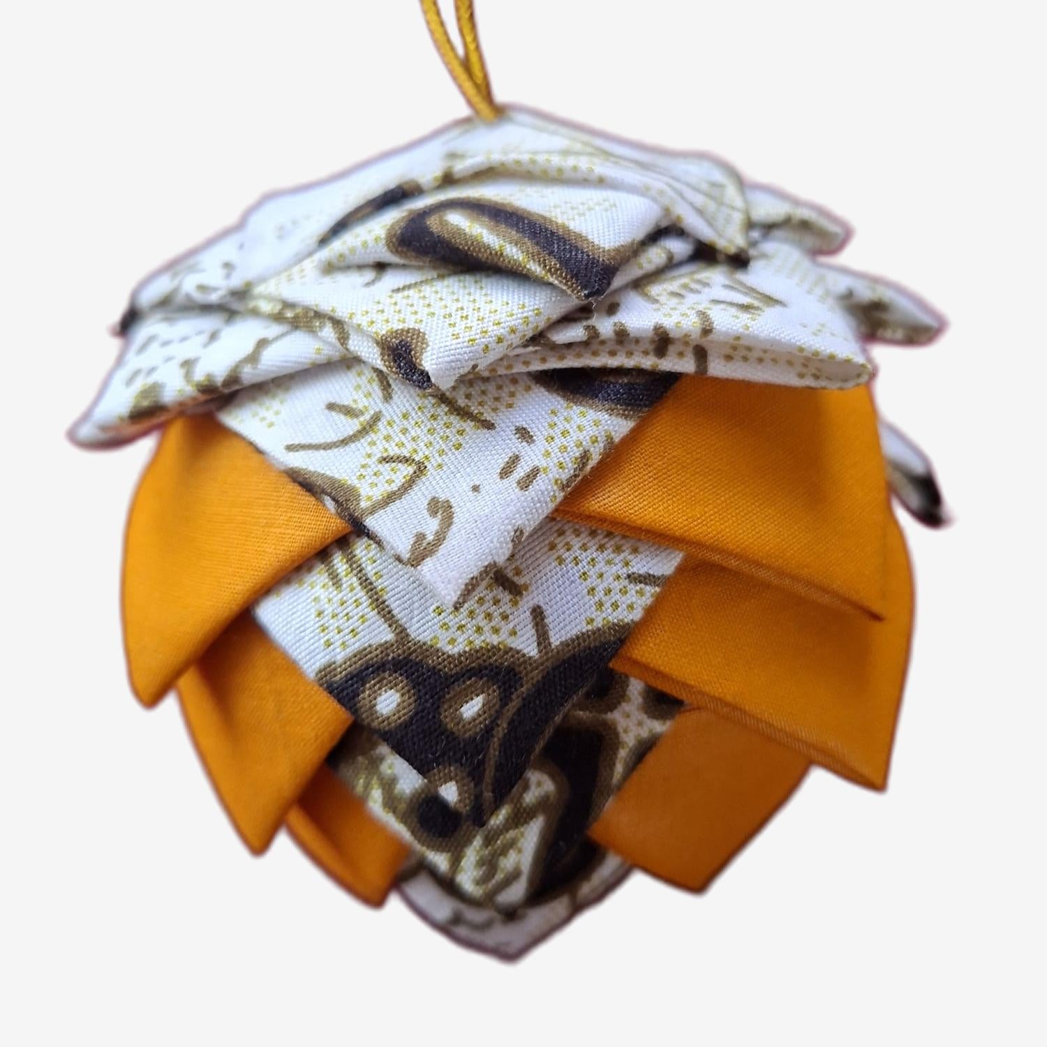 Bola de Natal artesanal com efeito pinha, feita à mão com tecidos africanos em tons vibrantes de laranja, castanho, branco e dourado.