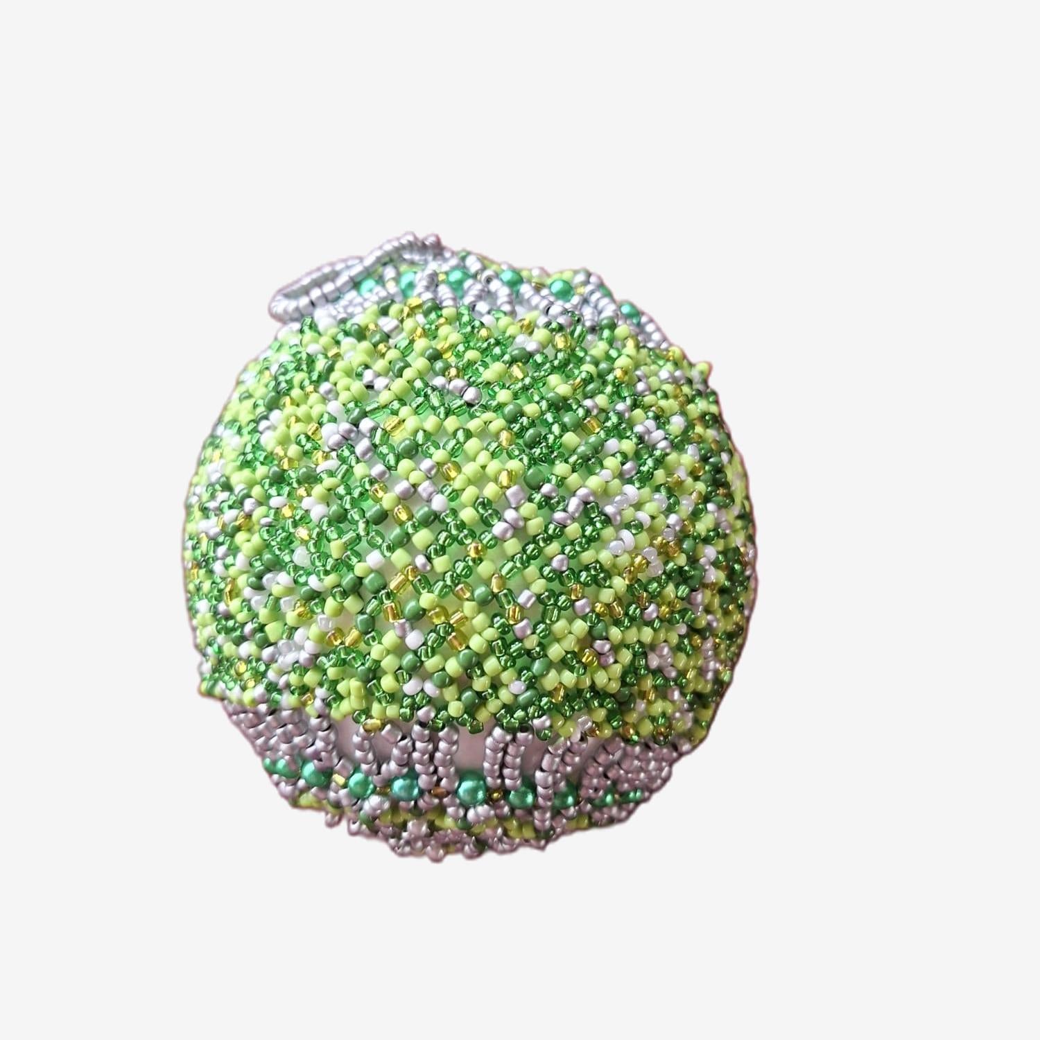 Bola de Natal artesanal em missangas, feita à mão com padrão geométrico em tons de verde e prateado.