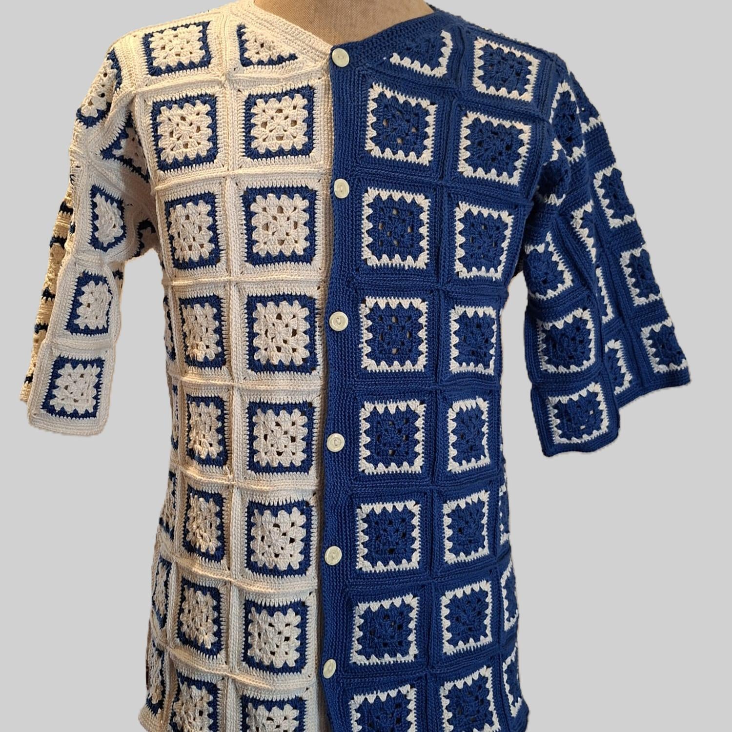 Esta camisa de crochê de quadrados bicolores é muito mais do que uma simples peça de roupa - é uma obra de arte feita à mão que combina tradição artesanal com estilo contemporâneo.