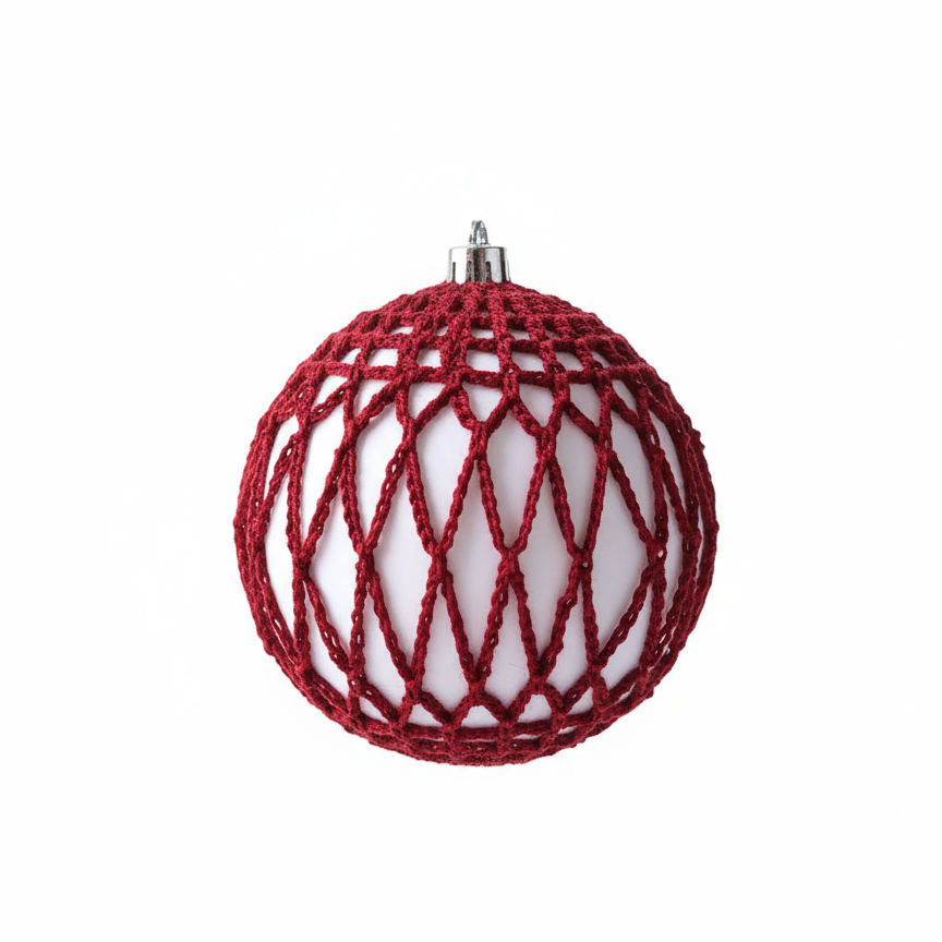 Transforme a sua árvore de Natal numa obra de arte com este conjunto exclusivo de 4 bolas artesanais em crochê! Cada bola apresenta um padrão único e delicado em linha bordeaux vibrante sobre base branca, criando uma coleção harmoniosa e sofisticada com um toque de elegância clássica.